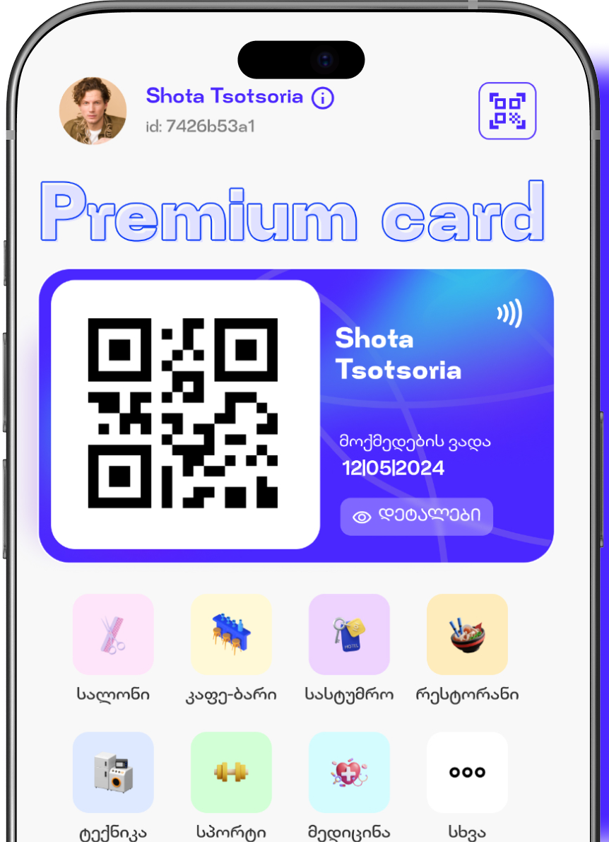 იმისთვის, რომ გამოიყენოთ პრემიუმ ბარათი, თქვენ მხოლოდ მისი აქტივაცია და QR კოდის ობიექტზე წარდგენა გჭირდებათ